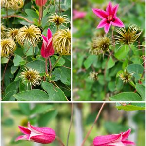今日のお花クレマチス ①本日のプリンセスダイアナ🩷 花びら6枚のも咲いています ②本日のロウグチ💜 まだ楽しめそうです♬ ③昨日ポストしたアイシャ しっかり開きました🤍 ④アイシャの蕊にズームイン✨ ⑤庭でたくさん咲いているダンスパーティーを1輪 部屋へ💞