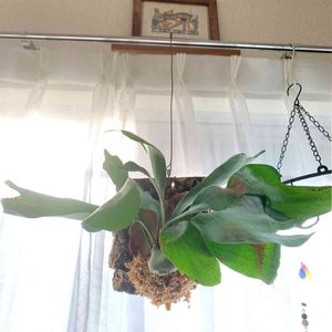 久々の投稿 リドレイ1号 我が家に来て新たに出てきた胞子葉 ポット売りだったので最初の胞子葉は真っ直ぐだったけど、吊り下げてからの新芽は、ちゃんと鹿の角みたいに上向きに 時期的に生長遅いけど楽しみ🤗