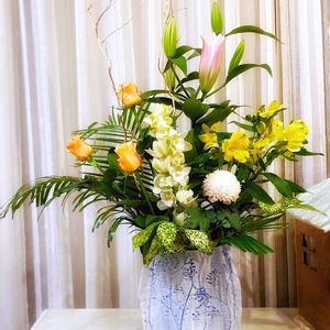心より愛と感謝を込めて花束を♥️🐾 今回はこんな感じだよ🐾♥️ ʕ๑•ω•ฅʔ꒒ ০ ⌵︎ ୧ ࿐♡︎💐 花材 オリエンタルリリー バラ シンビジウム アルストロメリア キク ヤシの葉 アオキスターダスト ゴールドの木飾り