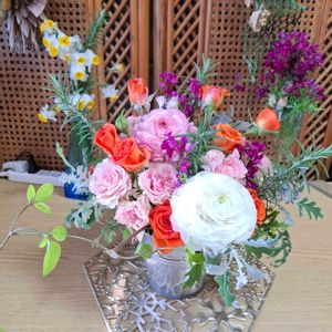 フラワーアレンジメント JAで買ってきたスプレーバラ2種類入ってこれで500円❗安い~✨ 庭のラナンキュラスやリナリア、白妙菊、ローズマリー、など花や葉っぱを合わせて 雛祭り🎎を意識した可愛らしい雰囲気のアレンジに! お部屋の中がお花屋さんのような良い香りで癒される~✨