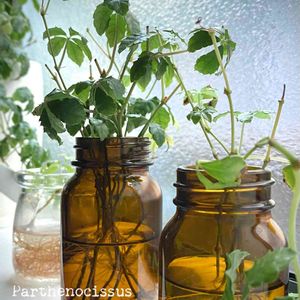 シュガーバイン☘️ 蔓が長くなってしまった時は 3〜4節ごとにカットして✂️ 小瓶に挿しています♪ 切るたびに水挿しするので💧 今は小瓶が3個💦 季節がよかったのかな? どんどん発根しています😊 もう少し根っこが伸びたら、 全部まとめてひとつの鉢に鉢上げします🪴