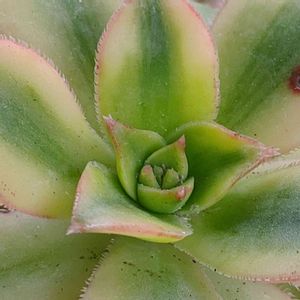 おはようございます(^O^☆♪ 6度 やっぱり多肉いじってる手🫱がまだ冷たい🧊 今朝はこんなに成長してきている 『サンバースト 』アエオニウム💚 ちょうど一年になるかな ももチャンからのいただき品 小指の爪先位のかわいい子がスクスク🎶 葉の縁がギザギザ 触らないでってかしら? 色合いにキュー(*ノωヾ)ーン♡です💚