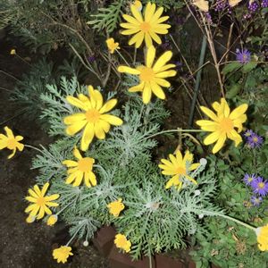 今日のお花 ユリオプスデージー🌼日が落ちましたが綺麗に撮れました。2枚目は少し早い母の誕生日にお迎えしたネメシアさんメーテルグッピー