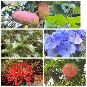 標高400メートルの山あいは絶景が広がり、心を癒す美しい自然がたくさんあり、なんといっても涼しい〜🥰 アケビと思ったけど、どれも開いてないのでムベ❓ 紫陽花と彼岸花が同時に咲いてた🫢 ザクロも沢山実ってた🩷 柊の濃い緑が美しい🤩 小さい秋見つけました🍂
