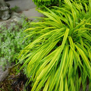 風知草、黄金になりグリーンに映える🧡💚 クネクネのラセンイ、もつれないよう時々、手ぐしでほどいてみたり!