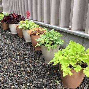 殺風景だった自宅と車庫の間に鉢を並べてみました。