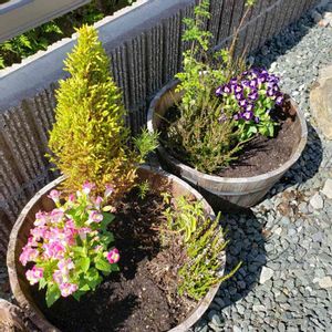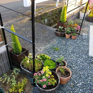 少しお庭の模様替え。 アーチ幅が広いので、中に植木を置くのも素敵だと発見しました😆