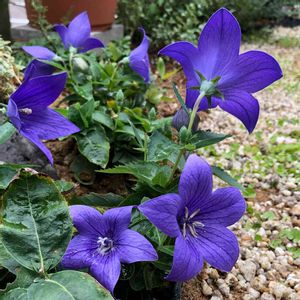 キキョウ アストラブルー 乱れ咲き この種は地面に近いから 雨が降ると泥だらけ 根元に砂利を敷いてみた