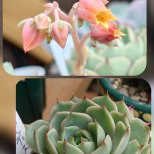 今日のお花 エケベリア 今咲いているのは ① ベンバデスさんだけだわぁ·͜· ꕤ︎︎ 私はエケさんの実生は苦手なので😅お花が咲き始めたら✂✂✂🙏💦 ② は白っぽい子たちかなぁ( *´艸`) ③ はちょこっと面白い子 先日消毒シュシュしたのでテンテンが😅