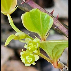 今日のお花 🌱 サルトリイバラ🌱 サルトリイバラ科 シオデ属 落葉つる性 雌雄異株 ❶花 2025年4月17日 ❷青い実 〃 6月 1日 ❸❹赤い実 〃 11月27日 ❺紅葉 〃 1月 2日 ❶雄花 小花が集まって半球、基本雄蕊は6本、花びらは光沢があります。 雌花はまだ見たことありません。 雄花よりも小さいそうです。 小花が集まり球体、雌しべの先、柱頭は3裂。花の下がふっくらした子房があります。 赤い実が生るのは雌株。 里山散策にて。