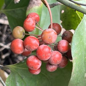 サルトリイバラの実と葉っぱ 赤い実、ツヤッツヤですね。 この葉っぱを見ると思い出すのは、 ちっちゃい頃は柏餅といえばこの葉っぱだったから、これが柏の葉だと思い込んでいたこと。最近とんと見かけないと思っていたら、地域によっては今でもサルトリイバラの葉が一般的だとか。 過去写真(葉は2023.8、実は2025.1撮影)より 余談ですが、柏餅は味噌餡が好きといえば 出身地バレますかね?