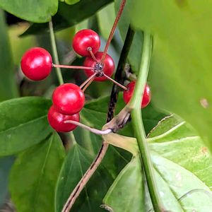 おはようございます🌅 今日のお花サルトリイバラ サルトリイバラ科サルトリイバラ属の落葉つる性半低木 別名-ガンタチイバラ、 カカラ🌿💛🌿 ①雌雄別株で↑この子は雄花💛花被片(花弁と萼片)は6個で長さ約4mmの長楕円形💛 上はそり返り雄しべは6個💛 雄花の雌しべと雌花の仮雄しべはともに退化し、ほとんど目立たないそう💡 ②葉っばは互生🌿 長さ幅とも3〜12cmの円形〜楕円形で先端は小さくとがり基部は円形🌿 ふちは全縁で革質🌿表面には鈍い光沢があり両面とも無毛で脈は3〜5個あり表面で凹んでます🌿 葉柄には托葉から変化した長い巻きひげが1対あるの見えますか❓️ ③お花が終わり青い実に🟢 実は液果で直径7〜9mmの球形🟢 ④秋に朱赤色に熟します🔴 ⑤枝に鈎状の刺が散生し刺と葉柄の巻きひげで他物に絡みついて茎を伸ばしてます🌿🌀🌿 🏷️可憐な火曜日 🏷️赤い実 🏷️愛の花♡ 高尾山で🏕️①②2024.4.26 ③2025.9.24 ④⑤2025.11.17