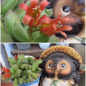おはようございます😊 お土産にもらった可愛いタヌキちゃんで タヌキ祭り❣️参加します٩(๑❛ᴗ❛๑)۶ 『子猫の爪』お花が咲きました🧡 まだいくつか花芽が出てますが…この子はお花咲かせても大丈夫でしょうか🧐