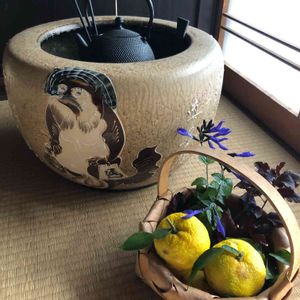 おはようございます こてきちさんの「タヌキ祭り」 参加します😊 前回の参加でも登場した火鉢の渋いタヌキさん (これしかない) 収穫した柚子と一緒に♡