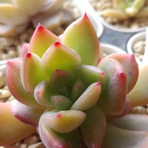 先日エケベリアを10個ランダムで通販したのですが、 本日おまけ付きで12個届きました🤣💕 ありがたき幸せ💕💕 しかも持っているものと1個も被らずに届きました🥺 (そもそも沢山持ってない) そして何か気付きませんか!?🥺笑 なんと「桃太郎」が届いたんです!!😆💕 左中央です🍑🍑 普及種と言われながらも、 これまでお目に掛かる機会がなく😂✨ 実家の方で確保してもらっていた分もありますが、 念願の桃太郎が我が家に来ました😆🍑 記録のためにまた1個ずつ 載せていきたいと思います🥺