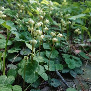 ジンヨウイチヤクソウ (腎葉一薬草) ツツジ科 イチヤクソウ属 6~7月 6~15(20)cm 在来種 多年草 葉は腎円形で基部は深い心形、濃緑色で葉脈に沿って白い斑が入る 葉の先端は丸いかやや凹む 長さ1~2(3) 幅1.5~3(4)cm 葉柄は長さ2~5cm 2~3個が根生 花茎に緑白色の花を2~6個下向きにつける 花径約1cm 花冠は5深裂 雄しべ10個で葯室2 葯の先端に穴が開き、そこから花粉を出る(孔開葯) 花柱は花冠から長く突き出て湾曲する(柱頭は小さく5裂) 萼片は5個 卵状円形で長さと幅がほぼ同長 裂片の先は尖らない 花茎に鱗片葉は無いか、あっても線状のものが1個