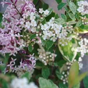 矮性の姫ライラックと斑入りコデマリのピンクアイスです✨ ライラックは芳香を放ち、そばを通るたびにクンクン💓 ピンクアイスはスーパーで数年前にお迎えしたのが3倍くらい大きくなりました😁