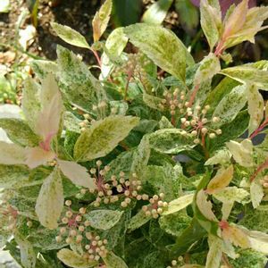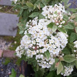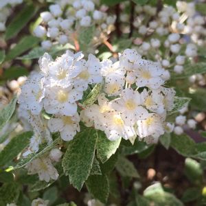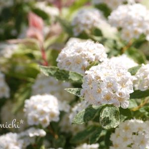コデマリ「ピンクアイス」が開花し始めました。 蕾はうっすらピンクですが、白花が咲きます。 斑入りの葉が柔らかい印象😊