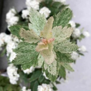 コデマリ ピンクアイス 斑入りの葉の新芽🌱はピンク色💓 つぼみも薄いピンク色でした🌸 あっという間に開いて、可愛いつぼみを撮れずに過ぎてしまい残念😅 でも、お花は長く咲いてくれているので、ハッピーです💕✨