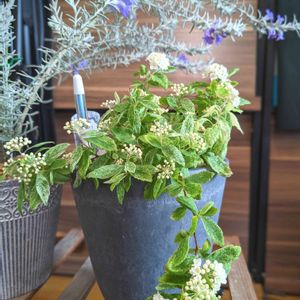 🤍コデマリ ピンクアイス🤍 春の嵐🌀で大荒れのため、室内避難中の 今日のお花コデマリです😊 写真では見えないんですが、新芽の茎がピンクで葉が白くってとってもかわいいんです✨ ようやく咲き始めたばかりなんで、これからが楽しみ〜〜 もう少ししたら左側のエレモフィラと同じような白いアンティーク鉢に植え替えしてシャビーな感じにしたい😆