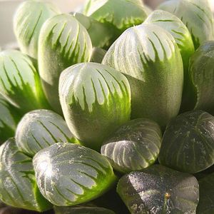 ハオルチア属 雫石 トゥルンカータ この子はちょっと徒長気味。 オブツーサの葉。よく見ると、なぜか上だけ透明に。この透明な部分、植物ファンの間では「窓」と呼ばれています。 ハオルチア、自生地では"地面からちょっとだけ"顔を出して生きています。動物から身を守るため、目立たないようにコッソリ暮らしているんです。 ただし生きるため、光合成はしなければなりません。なのでハオルチアは土の中に埋まった身体内部に太陽光を届け、そこで同化作用をしようと考えました。 光を身体内部に届けるため、葉の表面を「窓に」進化させたのです。 光る部分にフォーカスした写真を見ると「おおお!」と驚きますが、実際はすごく小さく、地味な子なんです。目立たず、こっそり生きるのが好きなんです(笑) なので店に並んでても、恐らく気づかない。上から当たる間接照明では全然光りません。だから「存在を知らないと、ちっとも欲しくならない多肉植物」だと思います。 でも一度知ったら、必ず欲しくなる。 窓辺で光にかざしてみて。宝石みたいに見えるから。