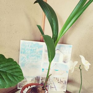 写真を見返してたら去年の夏のココヤシが出てきた^^* 買ってからちょうど1年目のヤシの木 まだこの頃は葉っぱが割れてなかったな。 買った当初の鉢はココヤシの実のサイズ位だったので実のサイズより3cm回り位大きい物を買ったつもりが… 目測誤り5cmほど大きな物になってしまってます(笑) 関東でも、室内で日当たりが良ければ特別な事は何もしなくても育ってくれるみたいです^^*🎵