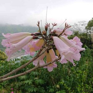 優しい💛黄色、細いラッパ状のノウゼンカズラに似た花。鉢植え。 AIの回答は、「イペー」 「コガネノウゼン」とか、「ブラジルの桜🌸」 平川動物公園で大木を見ていたのに同じ花だと気づかなかった😂 プルメリアのある美容室玄関前で。