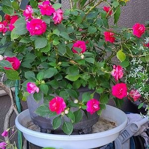 朝の散歩道で、インパチェンスが綺麗に咲いていた✨💗 あのプリメリアのあるお宅。 ❇️インパチェンス(八重咲き) ⤴️イペー ⤵️オキザリス ↪️ユーフォルビア·ダイヤモンド·フォレスト