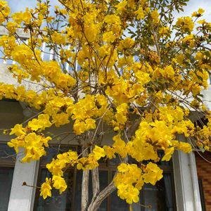 🏷日曜ビタミンカラー♪ 参加しま〜す😊 前のpicの黄色イペー💛 2階から見たらこんな感じ💚💛 2022/3/20 沖縄県那覇市首里にて お出かけして満開のイペーと思いましたがどこも車の往来の多い道路植栽なので自宅からに‥