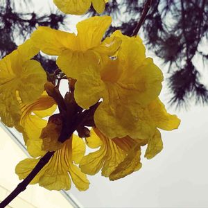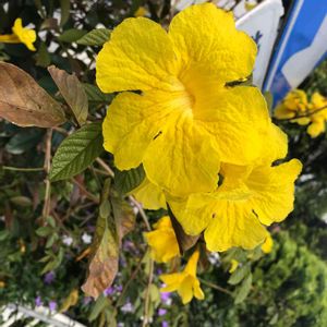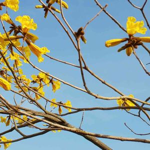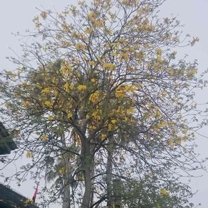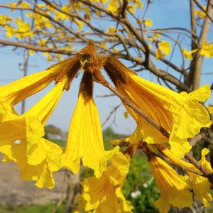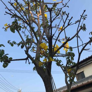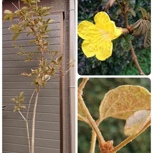🍀イペーの花‼️ 南米産の原産地 路地に植えてある黄色い花の木を見て!4~5年前にお迎え‼️去年初めて咲いてくれましたが.……1週間前の霜で元気がなくなってしまいました!😣来年咲いてくれるかしら❔