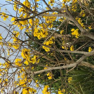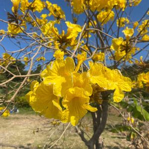 大きな木にたくさんの黄色い花が咲いています🌼緑の葉っぱは別の樹木のもので、この樹木は葉っぱなしの花のみです。 運転中に鮮やかな黄色をたくさん見かけ、ずっと気になっていたので、ようやく写真におさめる事が出来ました☺️ AIでイペーと判明〜🌿✨ ・ブラジルの国花 ・別名:コガネノウゼン 2023.3.1〜3沖縄旅行✈️