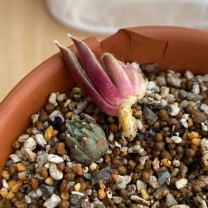 バニラシフォンさん、やけに傾いてるな−って思ったら茎の半分腐ってました^ ^; 正常な茎からは白い根が出てて、成長点もギリギリセーフだったのでこの状態で植えてみます‼︎ 子株は強風の日にどこかに飛んでいってしまい一個しか残ってないし、頑張って−;ω;