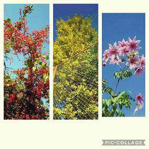 真っ赤な実のピラカンサス 黄色く変身中の イチョウの葉 今が見頃の 皇帝ダリア 散歩しながら見付けた秋の風景