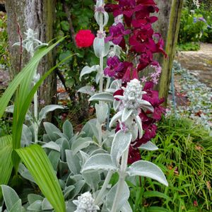 ペンステモン ルビーレースとラムズイヤー ラムズイヤーをたくさん頂いた時 白い花コーナーに植えた残りを 空いてた場所に植えていました。 自分では考え付かない ソフトなシルバーリーフと深いルビー色の花の組み合わせが 凄く目を引くのです🤭 それにしても ラムズイヤー 柔らかさ、触り心地 癒しの花ですね❤️