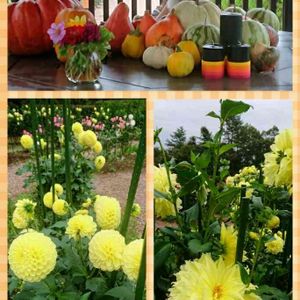 上の写真はハロウィン🎃のカボチャが大小いっぱい🎶 愛犬めい🐕1歳1ヶ月です💖(白ポメラニアン) 左側 リフレッシュ 花径中大輪 フォーマルデコラ咲 黄色のコロコロとした丸いボディーが可愛らしい ダリアです(*˙˘˙)♡ 右側 月世界 花径 大輪 インフォーマルデコラ咲 淡い黄色で夜空に咲く花火の様なダリアです どちらも、とても奇麗で目を惹きました(♡ˊ艸ˋ♡) 国営武蔵丘陸森林公園にて🌲🌳🌿