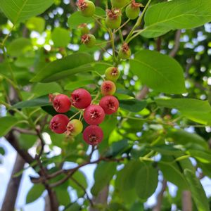 ジューンベリーの実がもう色付いてました。 今年は、💠花が少ないかな~と思ってましたが、結構な数が実ってます😃 ここ数年、🐦️さん達も知って食べ放題🍴🆓✨私にも残しておいてヨ