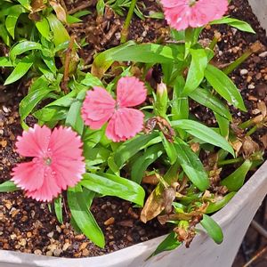 猛暑と台風🌀の雨が重なり、鉢植えのなでしこは疲れ気味のはず🤔 蒸れてビシャビシャなのに💦 それでも3つも花が咲いてて💞 スゴいな💪とエアコンの効いてる室内で思ってる私です(。-人-。)