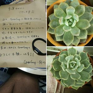 こんばんは🌙😃❗️ 今、🏠に帰ったら📬にGSの封筒が入ってました😆 GSスタッフさん有り難うございます🙇大事に使わせてもらいます✨ ラウリンゼとローラが暑さに負けずに夏を乗り切ってくれました🙌 うちの多肉さんで1番綺麗なお二人様です🤗