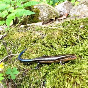 ニホントカゲの幼体です 光沢のあるシマシマ模様が美しく目を引きます 成体になるとシマシマ模様も青い尻尾もなくなり 光沢のある銅色の側面に茶色の太い帯が入ります