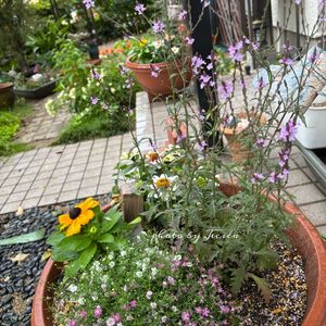 シンメトリーに寄せ植え 向こうにも ちょっと地味だな 2枚目 園芸店のオーナーさんから のプレゼント やったー♪ 3枚目 バラ ジュード 4枚目ヒューケラの花 5枚目 アメリカデイゴ🇺🇸 ご近所さんの庭