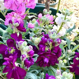 ストック 剪定を終えたバラの鉢元に、 彩りを添えてみました💕 バラに守られて、 ここならカラスに狙われないわ(≧ω≦)