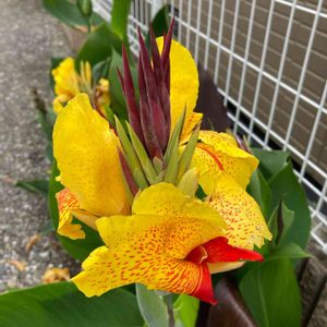 ミニ カンナ(30日撮影) あららっ? 虫に食べられたみたいです。 2色同時を楽しみにしていたのに残念❣️ その左横のバラの葉っぱに小さなアオムシがいたので…。あ〜あ😆😅