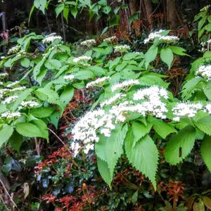 コアジサイのような白い小さいお花を発見。 低木ですね。 遠目だと、葉っぱに雪が積もってる様で綺麗です。 花弁5枚で平開。雄しべは5個、ぴよ~んと長いです。 コバノガマズミ(小葉蒲染)でしょうか?