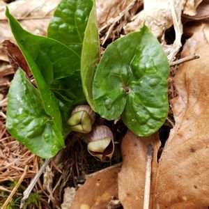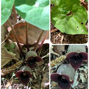 フタバアオイやカンアオイ類はたくさん生えてましたが、フタバアオイの花はほとんど終わって枯れ落ちる寸前、これは花がありました。 花と葉の姿から、カンアオイ属の中でも落葉性の「ウスバサイシン」でいいかなと思います😊