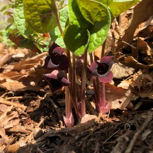 ウスバサイシン(薄葉細辛) フタバアオイを観た後に、これまた、似たような葉っぱが沢山だわ~ でも、ちょっと違う (-д- 三 -д-)チャウチャウ と思ったら、ウスバサイシンの葉っぱらしい。 花が咲いてるかもと、覗いてみました👀🎶。 葉っぱの下に、形がユニークで、地味~な色味のお花が咲いていました。 ウスバサイシン(薄葉細心)の名前の由来は、カンアオイより、葉が薄いので「薄葉」、細い根は、辛味があることから「細辛」。 根や根茎は、細辛(サイシン)という生薬💊。 解熱鎮痛作用があって、 漢方方剤にも使われるそうです💊。 良薬は口に苦し、昔の人は、これが薬になると発見したところが凄い〰️😲。 双葉葵も、薄葉細辛も、地際に咲く地味な春のお花でした。お花を見つけて嬉しかったです。 (赤城自然園)