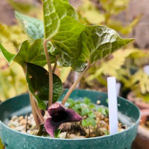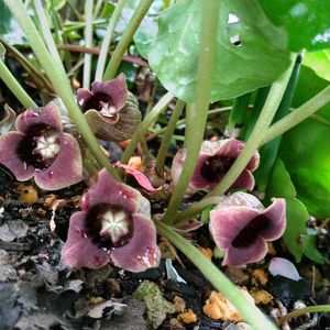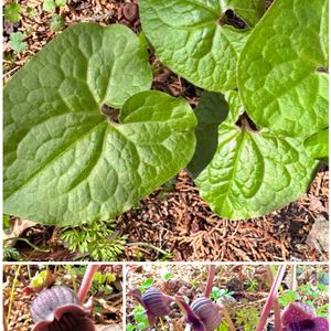 ウスバサイシン (ウマノスズクサ科 ・ カンアオイ属) 葉に隠れ秘かに咲いています。 この季節のお楽しみ、そっと覗き見させて頂きます。 葉は切り込みの深い卵心形💚、花はとても地味な紅紫色の萼筒で先が3裂し外側に反り返り花弁のように見えます。