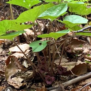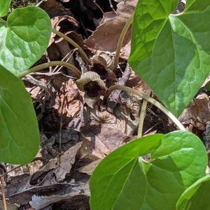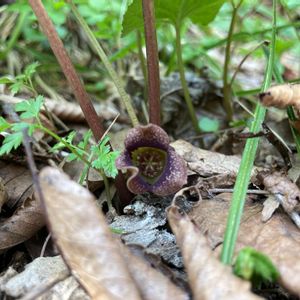 ウスバサイシン(薄葉細辛) ウマノスズクサ科カンアオイ属 他の仲間と比べて、葉が薄いこと、味が辛いことが名前の由来 地元の方の案内で、変わった形のお花を見ることができました☺️