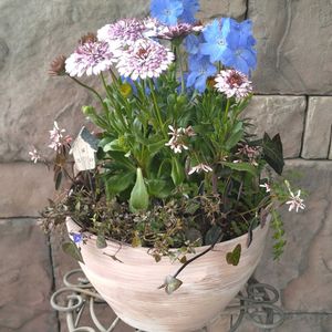 4/8に寄せました ダブルオステオスペルマム サンドベージュ デルフィニウム チアブルー ユーフォルビア ピンクフロスト ヘデラ サーク ネモフィラ(こぼれ種のもの庭から調達) ベロニカ オックスフォードブルー(庭から調達) 手前のオックスフォードブルーと右側のネモフィラが咲いたら、青いお花がプラスされて、また印象が変わると思います🤗