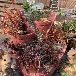 段々とお庭の飾りものも増えてきました🙌 可愛い♪ ↖️家型プランター🏠️(アニメーションプランター)とインコちゃん🦜 (最新メンバー それぞれカインズとセリア) ↙️切り株のお家プランター(アニメーションプランター)に住むウサギちゃん🐇 ↗️ガーデンテーブルにはカップに入ったトイプードル☕️🐩 ➡️ベンチの上に本型プランター📕 ウサギちゃん🐇 時期的にイースターエッグ🥚 ↘️切り株鉢🪵とリスさん🐿️ どれも安物ばかりだけどお気に入りです🤗