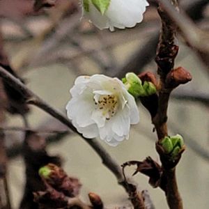 【ジュウガツサクラ】 全体のつぼみの3分の1が 10月頃から咲き (開花ピークは11月) 残りの3分の2は春に咲く 1年に2回楽しめる らしいです 八重のフリフリ 小さなお花 ポツポツと咲いていました 桜はいつ見ても嬉しいです